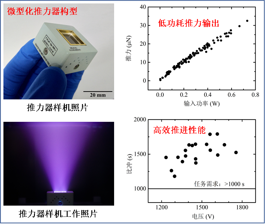 基于上述离子液体电致发射过程的机理认识,突破结构设计、材料制备、器件加工等多项关键技术(公开发明专利3项,授权软件著作权1项),打破常规离子液体选用方案,研制出具有启动电压千伏以内的离子液体电推力器样机,远低于液态金属场发射推力器数千伏至上万伏的工作电压,显著降低电源系统难度,具备千伏级电压条件下高效率性能输出能力(比冲千秒量级以上),电能消耗低至1W以内,能够满足空间任务需求,为微纳卫星提供高性能备选推进方案。