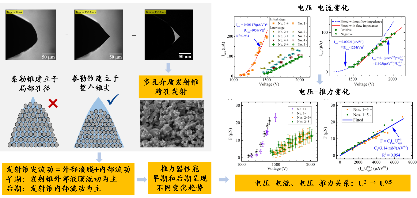 (1) 采用分离式显微成像技术获得了高分辨率离子液体电致发射光学图像,研究了强电场作用下离子液体在锥形多孔介质尖端的流动状态和直接液相电离起始过程,探究了离子液体物性在电致发射过程中的影响规律;