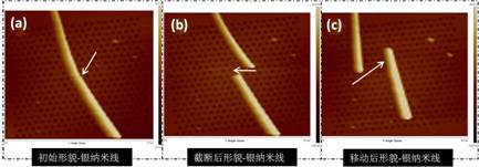 图4 银纳米线(a)初始形貌;(b)施加横向力阶段后形貌;(c)纳米操控移动后形貌