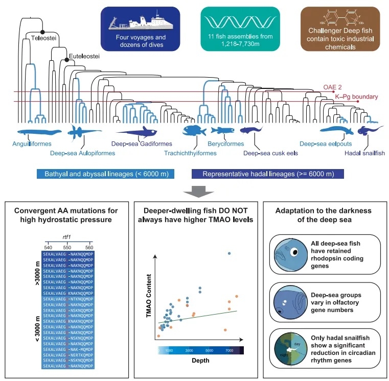 为填补这一空白,团队与中国科学院深海科学与工程研究所展开联合研究,经过多次深海巡航,采集了来自深海不同区域的11种鱼类样本。通过对这些样本的基因组数据进行深入分析,研究团队构建了深海鱼类的"生命进化树",揭示了脊椎动物征服深渊的历程。结果显示,少数类群的深海鱼类在1亿年前便开始适应深海环境,而大多数现存的深海鱼类则是在6500万年前的大灭绝事件后才进入深海区域。进一步的研究发现深海鱼类展现出较低的突变速率,并且与DNA修复及细胞膜功能维持相关的自然选择信号,同时对深海黑暗环境的也发生了不同层次的适应性改变。
