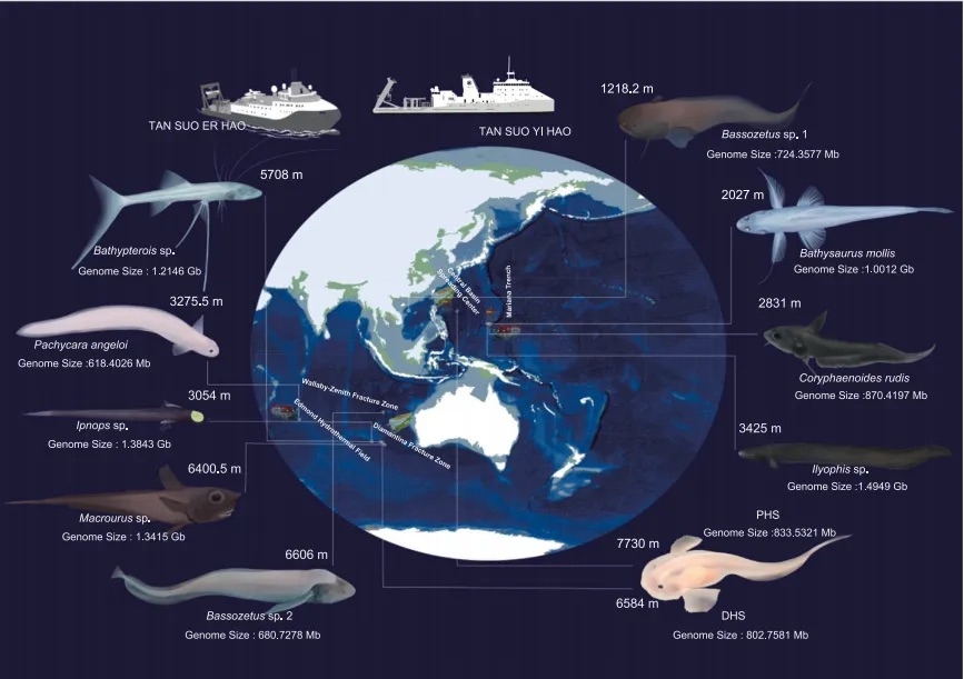 研究团队此前以深渊区域的代表性物种——超深渊狮子鱼为研究模型,深入探索了该物种在极端环境中的适应性遗传机制。团队分别于2019年在《Nature Ecology & Evolution》(《自然-生态与进化》)和2023年在《eLife》期刊上发表了相关研究论文,揭示了超深渊狮子鱼的生存密码,发现这群"深渊居民"在感官系统、昼夜节律及骨骼系统等方面均发生了重大适应性变化,并从细胞层次揭示了其应对高静水压力的遗传基础。然而,由于研究集中于单一物种,关于脊椎动物在深海环境中适应性的全面理解仍有所欠缺。