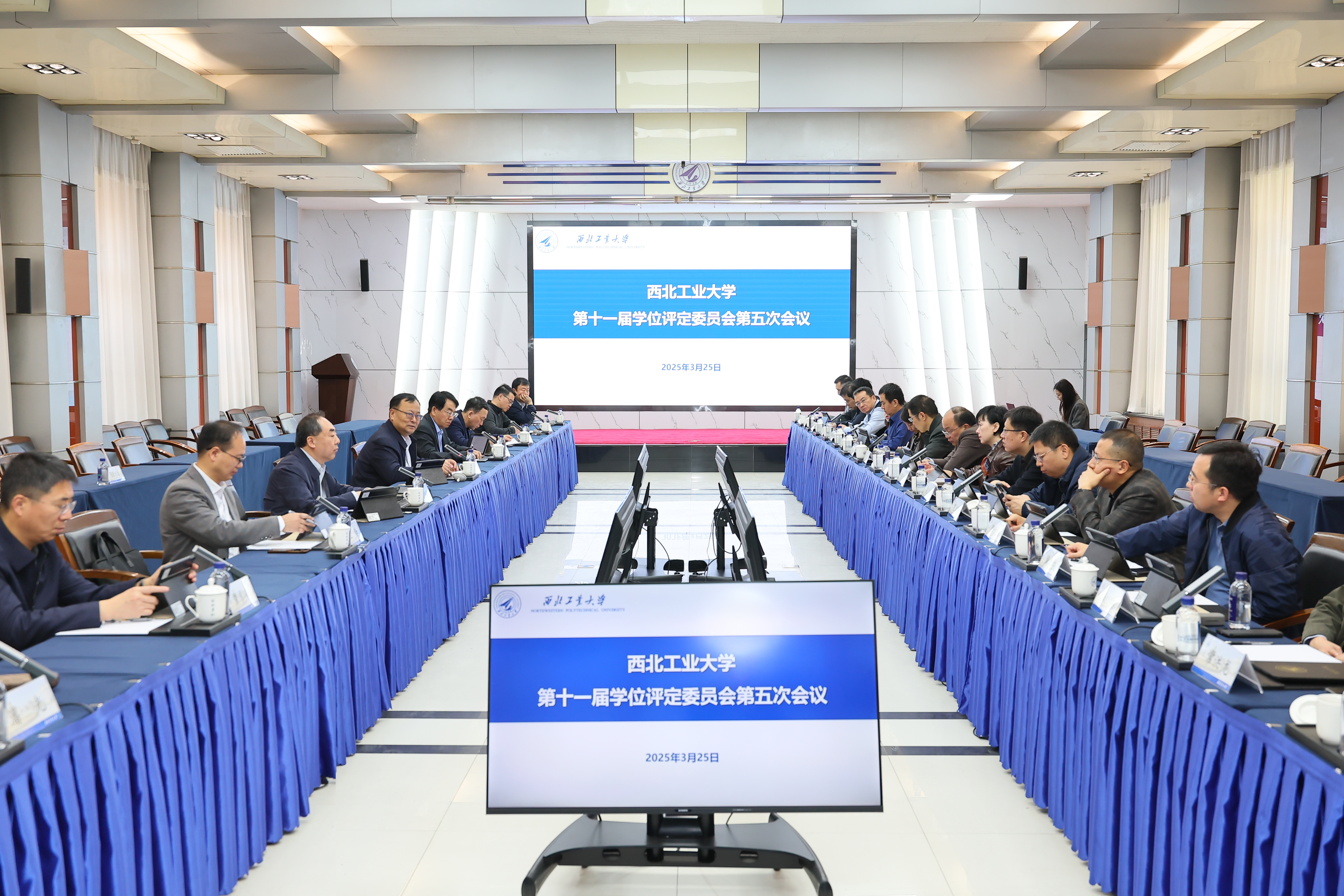 3月25日,beat365第十一届学位评定委员会第五次会议在友谊校区召开。校学位评定委员会主席、校长宋保维出席会议并讲话。第十一届学位评定委员会委员参加会议。会议由学位评定委员会委员、副校长岳晓奎主持。