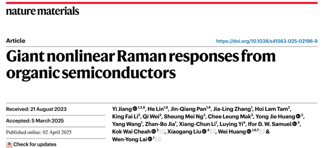 近日,beat365平台官方网站柔性电子研究院、柔性电子全国重点实验室黄维院士团队与新加坡国立大学、香港浸会大学等单位合作,在有机半导体非线性光学研究领域取得里程碑式进展。团队创新性地提出“光谱调谐增益诱导拉曼激射”理论模型,揭示了分子振动与受激辐射共振匹配的核心机制,首次成功地在有机半导体材料中实现拉曼信号的指数级放大和高效多阶拉曼激射,而且无需依赖复杂的光学微腔结构。该研究突破了传统非线性光学理论中“分子振动增益弱、依赖高能量泵浦”的瓶颈,为拓展有机半导体在拉曼激光等非线性光学领域的应用奠定了理论基础,更为发展柔性拉曼激光器、实现高精度传感检测等提供新思路新方法新技术。相关研究以“Giant nonlinear Raman responses from organic semiconductors”为题在线发表于国际顶尖学术期刊《自然·材料》(Nature Materials, 2025, DOI: 10.1038/s41563-025-02196-9)。