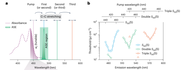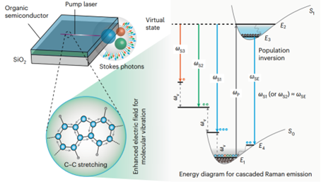 有机半导体因其独特的分子结构和光电特性,被视为下一代柔性电子技术的核心材料,在柔性显示、柔性光伏等领域广泛应用。然而,其非线性光学效应需依赖极高能量激发,导致材料易被强光损伤,长期制约其在非线性光学领域的应用。拉曼散射是一种基于分子振动产生光学增益的非线性光学技术,因其特有的分子振动特征信号和灵活的光谱可调谐性,在爆炸物检测、生物成像、光通讯等领域具有重要应用。传统拉曼激射技术依赖高能量泵浦光源以克服分子振动损耗,导致设备繁杂、成本高昂。如何实现“低阈值、高增益”的拉曼激射,一直是全球科学家面临的世界性难题。