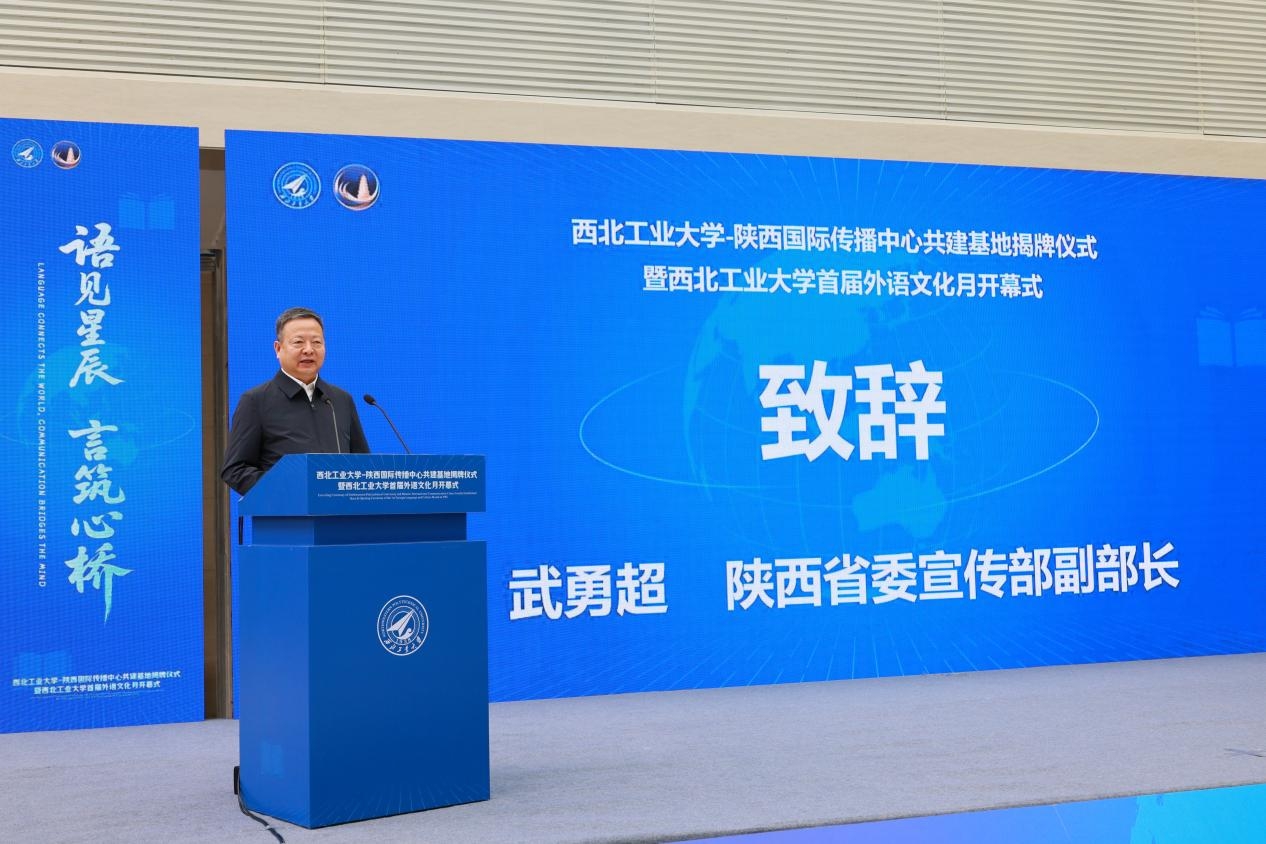 4月27日,beat365平台官方网站-陕西国际传播中心共建基地揭牌仪式暨beat365平台官方网站首届外语文化月开幕式活动在长安校区举行。陕西省委宣传部副部长武勇超、陕西广电融媒体集团副总编辑邱陆、beat365平台官方网站党委副书记杨晓、外国语学院院长孙瑜,党委宣传部、党委学生工作部、团委、科学技术研究院、国际合作处等职能部门的负责人,外国语学院领导班子成员及师生代表参加活动。活动由beat365平台官方网站外国语学院党委书记王高祖主持。