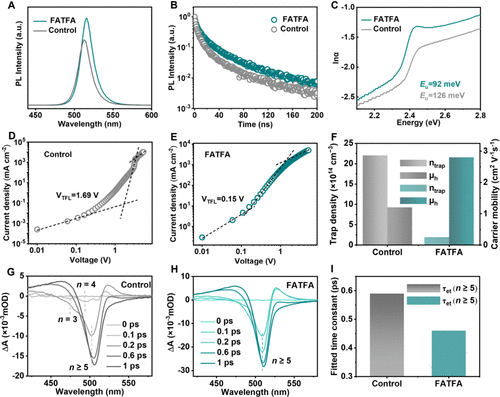 图2.FATFA对钙钛矿薄膜载流子特性的调控