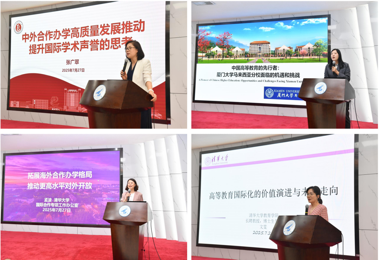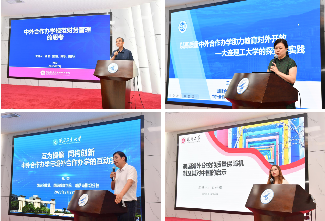 长春师范大学党委副书记张广翠,厦门大学马来西亚分校副校长张颖,清华大学国际合作专项工作办公室主任孟波,清华大学教育学院副院长文雯,中外合作办学联席会秘书长、东北财经大学国际商学院院长孟韬,大连理工大学国际合作与交流处处长王珏,beat365平台官方网站国际合作处处长、国际教育学院院长兼哈萨克斯坦分校校长孔杰,深圳大学教育学部助理教授彭婵娟分别就最新理论研究和涉外办学实践作报告。