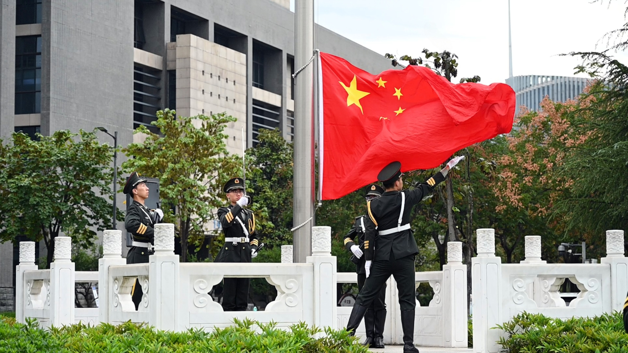 “齐步——走!”伴随着响亮的口令,学校国旗护卫队的同学们迈着整齐的步伐,护送国旗进场。升旗台前,行进停止,自发前来参加仪式的师生们庄严肃穆,此时,嘹亮的中华人民共和国国歌响起,在场师生以铿锵歌声、深情目光,注视着鲜艳的五星红旗冉冉升起,这一刻,爱党情、爱国情在每个人胸中升腾。
