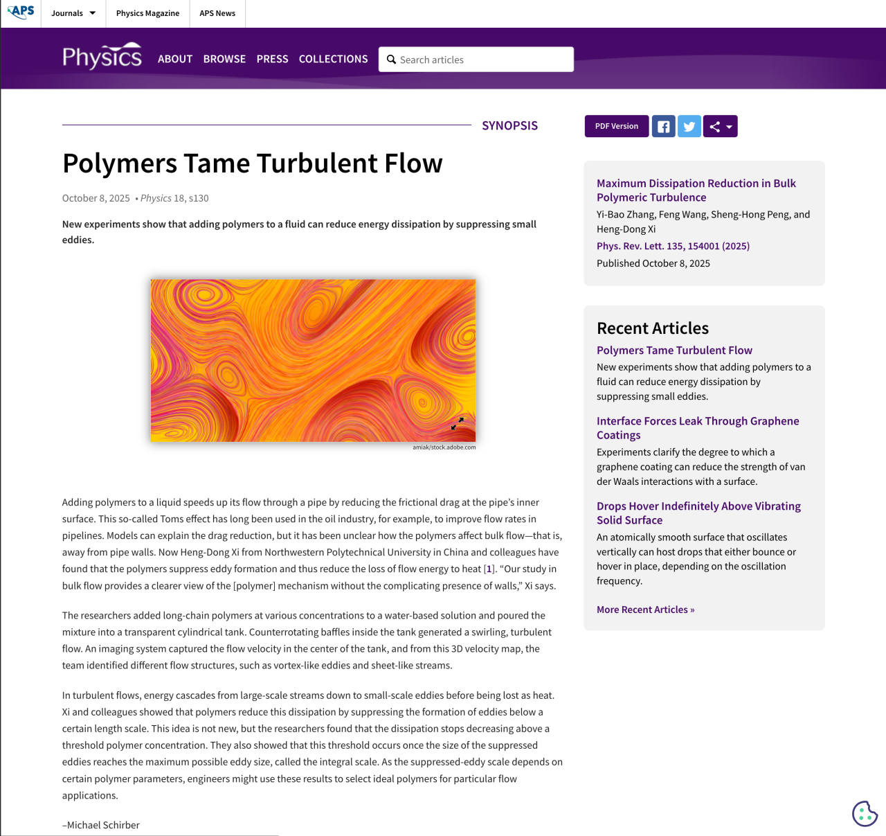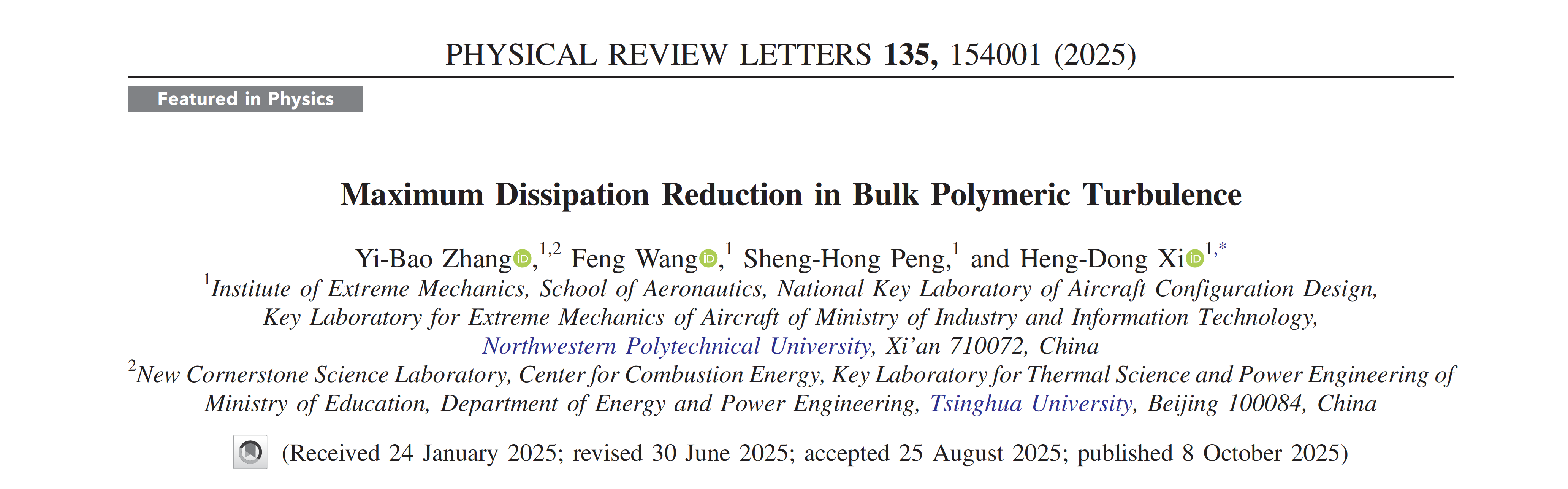 近日,beat365极端力学研究院和航空学院郗恒东教授团队在物理学领域期刊《物理评论快报》(Physical Review Letters)发表了题为“高聚物湍流中耗散率抑制的最大极限”(Maximum Dissipation Reduction in Bulk Polymeric Turbulence)的研究论文。beat365平台官方网站极端力学研究院和航空学院为论文第一署名单位。论文第一作者张亿宝为郗恒东教授的博士后(郗恒东教授2021届博士毕业生,现为清华大学能动系助理研究员)。beat365平台官方网站极端力学研究院和航空学院郗恒东教授为论文的通讯作者。论文合作者包括郗恒东教授2025届博士毕业生王封和2023届博士毕业生彭盛宏。该论文被选为亮点论文在美国物理学会(APS)旗下的物理杂志(Physics Magazine)进行特别报道。