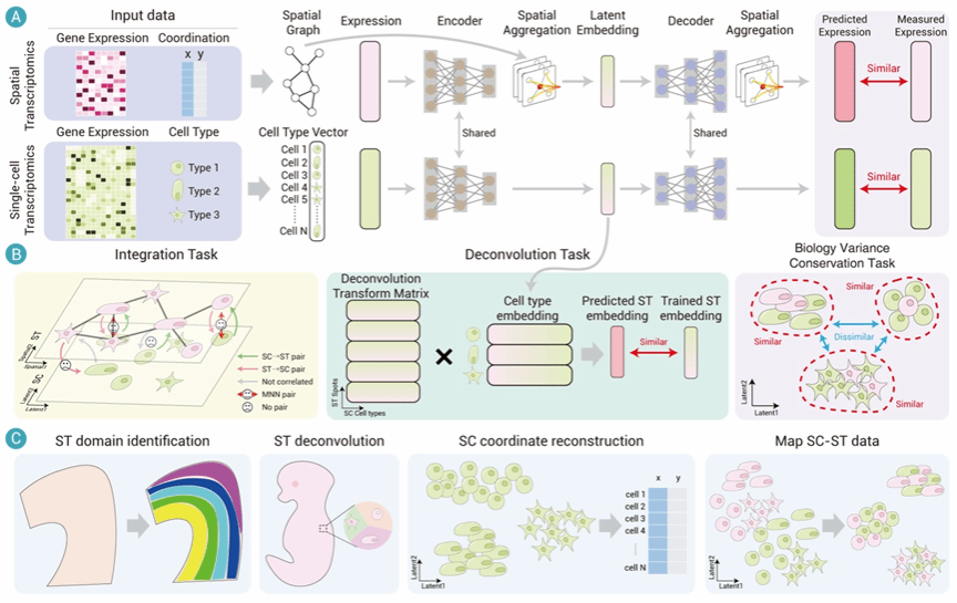 近日,计算机学院尚学群教授团队在单细胞与空间转录组数据整合分析方面取得新研究进展,研究成果以“stSCI:一种用于整合分析单细胞与空间转录组数据的多任务学习框架(stSCI: A multi-task learning framework for integrative analysis of single-cell and spatial transcriptomics data)”为题,于2025年12月3日在线发表于《The Innovation》期刊。《The Innovation》是由中国科学院青年创新促进会百余会员与Cell Press(细胞出版社)于2020年5月共同创办的开放获取英文期刊,覆盖自然科学全领域, 2025年5-year IF=40.2。计算机学院直博生舒涵为论文第一作者,beat365平台官方网站尚学群教授、汪涛副教授、复旦大学原致远研究员为论文共同通讯作者。