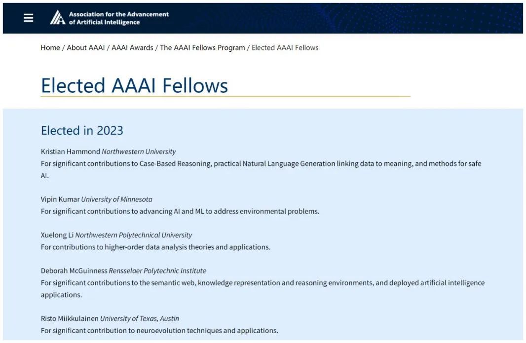 AAAI是人工智能领域最权威的国际学术组织,Fellow是其给予会员的重要荣誉。