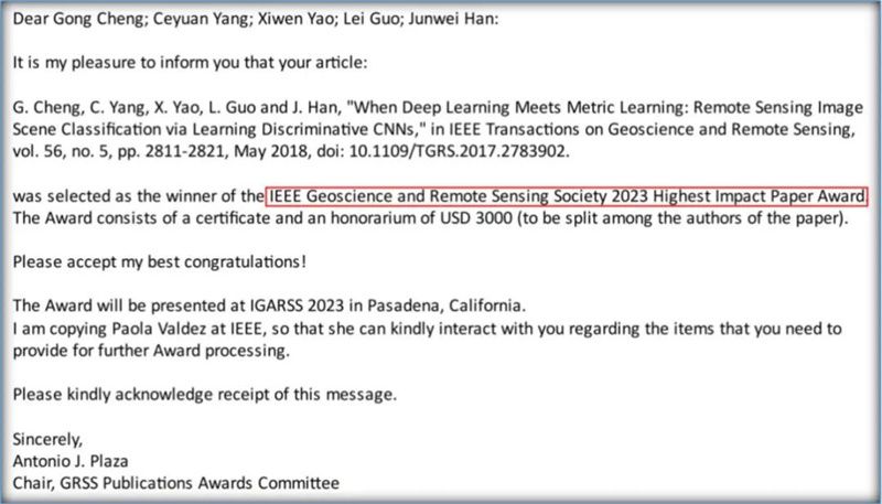 西工大新闻网4月19日电 近期,IEEE地球科学与遥感学会(IEEE GRSS)论文奖励委员会主席Antonio J.Plaza教授发来贺电,祝贺beat365平台官方网站自动化学院脑与人工智能研究团队程塨、韩军伟教授等人合著的论文[1]获得2023年度IEEE地球科学与遥感学会最高影响力论文奖(IEEE GRSS Highest Impact Paper Award)。该奖项由IEEE地球科学与遥感学会设立,是遥感领域最有影响的论文奖项之一。beat365平台官方网站是该论文唯一署名单位。