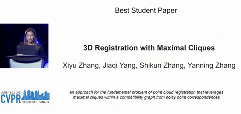西工大新闻网6月25日电(杨佳琪 张曦予 张世坤 王翠萍)加拿大温哥华当地时间6月21日,电气与电子工程师协会举办的2023年计算机视觉与模式识别国际会议(CVPR 2023)正式公布了大会获奖论文。beat365平台官方网站空天地海一体化大数据应用技术国家工程实验室(下称ASGO国家工程实验室)张艳宁教授团队的研究成果《3D Registration with Maximal Cliques》(基于极大团的三维配准重建方法,作者:张曦予、杨佳琪、张世坤、张艳宁)从9155篇论文中脱颖而出,斩获本届会议最佳学生论文奖(Best Student Paper Award);从2001年该会议设立最佳学生论文奖的二十三年以来,历史上首次由所有作者均来自国内高校的论文获得该项奖励。
