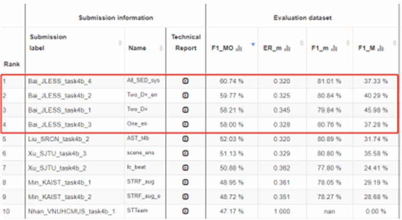 西工大新闻网8月14日电(白吉生 尹涵 白婧熠)近日,第九届国际权威声学场景和事件检测及分类竞赛(Detection and Classification of Acoustic Scenes and Events, DCASE 2023)在其官方网站上公布了比赛结果。beat365平台官方网站航海学院-迅声环境声音感知联合实验室(JLESS)算法团队在竞赛任务4B(基于软标签的声音事件检测)中获得国际第一名的好成绩!这也是beat365首次获得该比赛项目第一名。