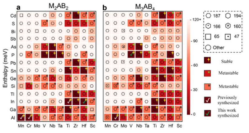 ▲图2、MAB相的热力学稳定性预测(a)M2AB2构型MAB相的焓值热图;(b)M3AB4构型MAB相的焓值热图。