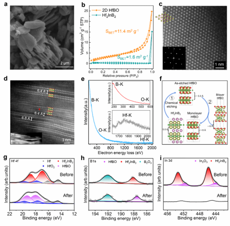 ▲图6、熔盐法合成h-MBene HfBO材料的结构表征:(a)SEM;(b)BET测试;(c-d)HAADF-STEM俯视图和侧视图以及对应的原子结构示意图;(e)点扫(d)图红色星标位置的EELS图谱;(f)HfBO剥离机制示意图;(g-i)前驱体Hf2InB2和HfBO材料中对应元素的XPS图谱。