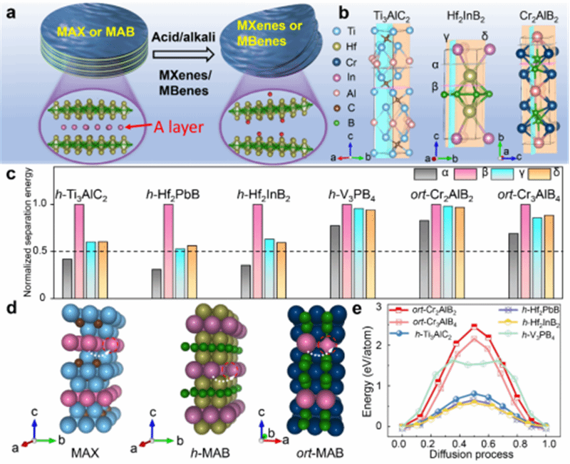 ▲图5、理论预测h-MAB相的剥离可行性 (a)h-MAB相剥离为MBenes过程的结构示意图;(b)典型h-MAB相、ort-MAB相和MAX相晶体结构示意图;(c)理论预测的典型h-MAB相、ort-MAB相和MAX相的界面剥离能;(d-e)理论预测的典型h-MAB相、ort-MAB相和MAX相的层内扩散示意图以及扩散势垒。
