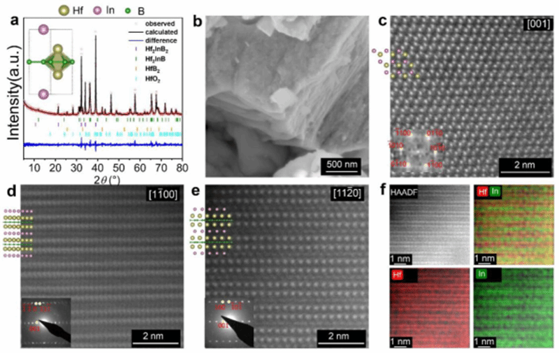 ▲图3、新型h-MAB相 Hf2InB2材料的结构表征(a)XRD精修图;(b)SEM;(c-d)沿着不同晶向的HAADF-STEM;(f)与(e)图对应的元素能谱分布图。