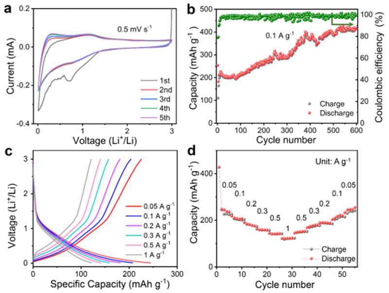 电学性能测试发现,h-MBenes材料HfBO其具有良好的金属导电性,是潜在的电极材料。因此,对制备的HfBO材料进行了系统的锂离子电池的储能电化学性能研究。长周期测试发现,随着循环次数的增加,HfBO电极材料的储存容量逐渐增加,然后趋于稳定。特别值得一提的是,在0.1 A g-1倍率下,HfBO经历了500个循环,储存容量达到420 mAh g−1。因此,HfBO作为电极材料具有高储存容量和良好的循环稳定性,表现出潜在的优异电极材料特性。