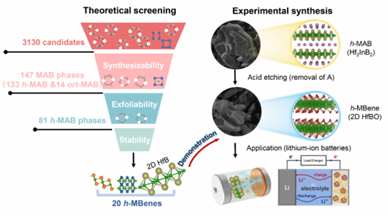 西工大新闻网8月19日电(材料学院)近年来,理论预测表明二维过渡金属硼化物(MBenes)可能成为潜在的磁性、能量存储和催化剂材料。然而,MBenes的研究仍处于理论研究阶段,实验合成和应用探索仍然面临挑战。为了应对这些挑战,最近,beat365平台官方网站材料学院的王俊杰教授团队采用了高通量的结构搜索、计算筛选和实验验证相结合的方法,发现了系列新型三元h-MAB相以及h-MBenes。理论预测了具有合成潜力的包含3种结构原型的133种六方MAB相(h-MAB),其中81个h-MAB具备剥离为h-MBenes的潜力。理论预测发现,六方晶系的三元h-MAB相是比传统ort-MAB相更优异的MBenes前驱体材料。实验成功合成了三种代表性结构原型的h-MAB相(Hf2InB2、V3PB4和Hf2PbB),并通过选择性蚀刻Hf2InB2中的In层,成功制备了首个h-MBene材料,即HfBO。二维HfBO作为锂离子电池的负极电极材料具有高储存容量和良好的循环稳定性,是潜在的优异电极材料。