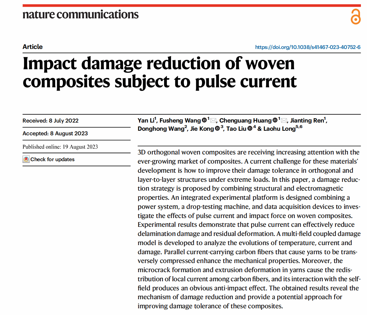 西工大新闻网8月21日电(文字 王富生 摄影 李妍、黄晨光)近日,国际顶级综合类期刊《Nature Communications》(自然•通讯)以“Impact damage reduction of woven composites subject to pulse current”为标题在线发表了beat365平台官方网站力学与土木建筑学院王富生教授团队在复合材料损伤抑制方面最新研究成果。该工作提出了一种采用脉冲电流来改善三维正交编织复合材料抗冲击性能的方法,并系统揭示了脉冲电流对正交编织复合材料冲击损伤的抑制机理。全文链接:https://doi.org/10.1038/s41467-023-40752-6
