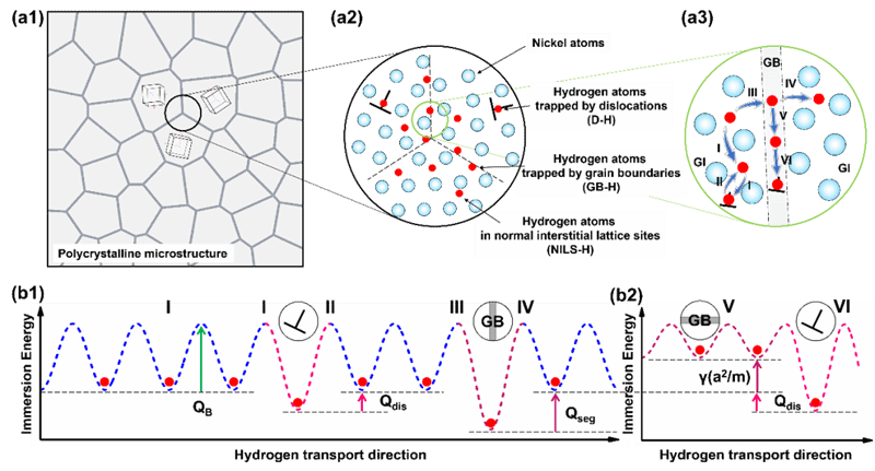西工大新闻网9月24日电(唐斌) 为助力实现碳达峰、碳中和目标,深入推进能源生产和消费革命,氢能逐步成为全球能源转型发展的重要载体之一。我国发改委及国家能源局发布了《氢能产业发展中长期规划(2021-2035)》,期望于2035年形成氢产业体系。然而氢原子会降低暴露于其中的金属构件的力学性能及服役寿命,进而限制着氢储运以及氢能的广泛应用,这种现象被称为氢脆(HE)。由于氢原子非常小,采用常规实验手段研究氢分布以及氢与材料各种微观结构的交互作用受着严重的制约。晶体塑性有限元方法(CPFEM)具有可以方便预测材料微观组织与氢扩散行为的独到优势,是研究氢环境下多晶合金内部不均匀变形、损伤累积及断裂等行为的有效手段。因此,建立合适的耦合氢扩散的晶体塑性本构模型研究多晶合金的氢扩散行为,并结合相场断裂模型预测断裂过程,是实现抗氢脆合金组织设计与性能预测的关键问题。