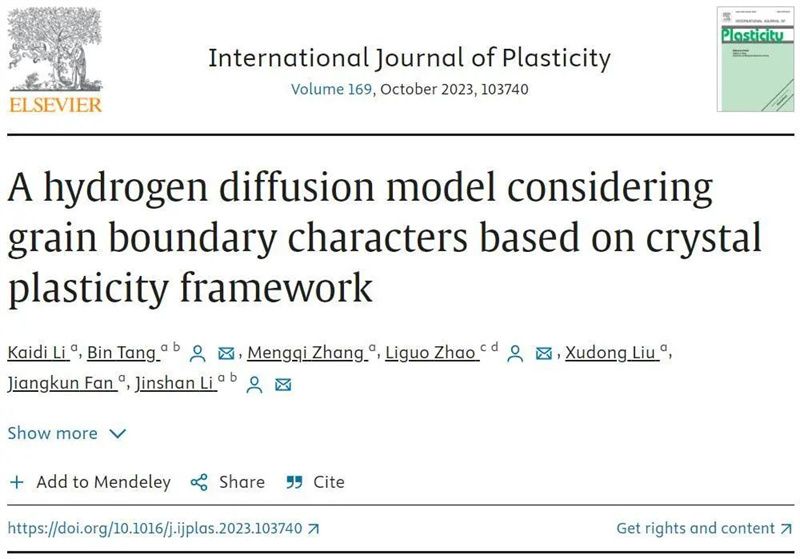相关研究以“A hydrogen diffusion model considering grain boundary characters based on crystal plasticity framework”为题发表在塑性领域国际顶级期刊International Journal of Plasticity (DOI: 10.1016/j.ijplas.2023.103740)。该论文通讯作者为凝固技术国家重点实验室李金山教授,唐斌教授,南京航空航天大学赵利果教授,第一作者为博士研究生李凯迪。该工作获得国家科技重大专项(J2019-VI-0023-0140)以及国家重点研发计划(2021YFB3702604)的资助和支持。