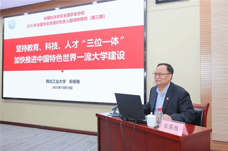 宋保维作题为《坚持教育、科技、人才“三位一体”加快推进中国特色世界一流大学建设》的主旨报告。他谈了对教育、科技、人才“三位一体”融合发展战略部署的学习体会,并从“校史校情”“创新发展”“新的目标”三个方面为研修班学员介绍了西工大发展历程,从人才培养质量、高水平师资建设、科技创新实力、社会服务贡献、国际合作新局面、校科协工作取得的新成绩等方面介绍了学校近年来的发展建设思路举措。