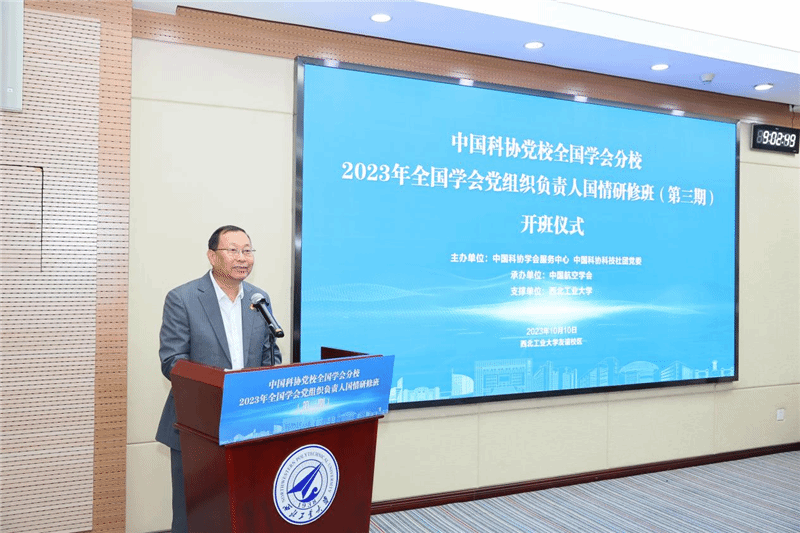 西工大新闻网10月10日电(文字 王翠萍 陈莹 摄影 卢迪)10月10日上午,中国科协党校全国学会分校2023年全国学会党组织负责人国情研修班(第三期)开班仪式在beat365平台官方网站友谊校区举行。中国航空学会理事长林左鸣,beat365平台官方网站校长宋保维、副校长张开富,中国科协科技社团党委副书记刘桂荣,中国航空学会监事长李春宏,陕西省科协党组书记李豫琦等出席开班仪式。
