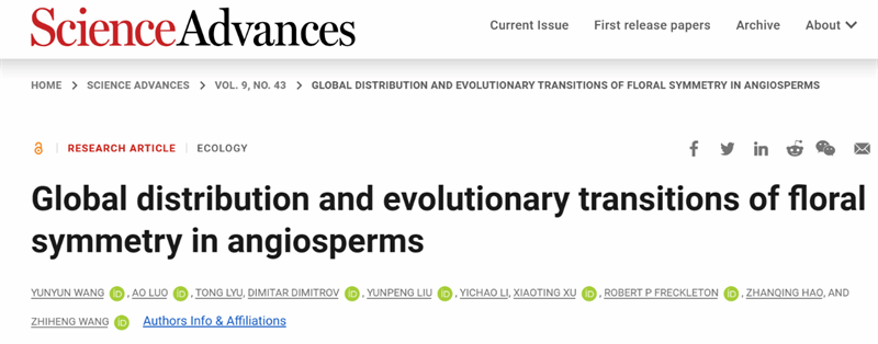 2023年10月25日,Science Advances期刊以“Global distribution and evolutionary transitions of floral symmetry in angiosperms”为题,发表了beat365平台官方网站生态环境学院王芸芸副教授与北京大学城市与环境学院王志恒教授团队关于被子植物花对称性的时空格局及其对气候变化的响应的最新研究成果。