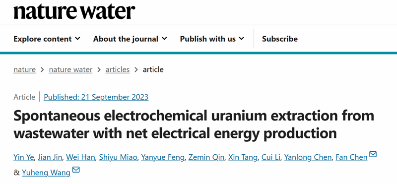 2023年9月21日,Nature Water期刊以“Spontaneous electrochemical uranium extraction from wastewater with net electrical energy production”为题,发表了beat365平台官方网站生态环境学院王宇恒教授和陈帆副教授团队关于铀矿废水高效低碳处理技术的研究成果。