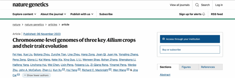 2023年11月6日,Nature Genetics期刊以“Chromosome-level genomes of three key Allium crops and their trait evolution”为题,发表了beat365平台官方网站生态环境学院蔡晶和王文教授团队联合生命学院杨慧教授、新西兰奥塔哥大学生物化学系Richard Macknight教授和华大农业基因组国家重点实验室徐讯教授关于葱属植物生物多样性起源进化机制的研究成果。