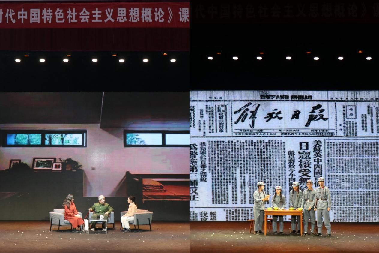 课程剧打破了传统的思政课教学模式,积极拓展第二课堂,从剧本研创到舞台展演,参演师生共同打磨、挑选题材,深入研讨剧本,用戏剧眼光再创文本、以团队力量协同创演、从舞台效果重塑角色,400余名大二学生、历时20余天精心编创《概论》课程剧,让思政课“活”起来。