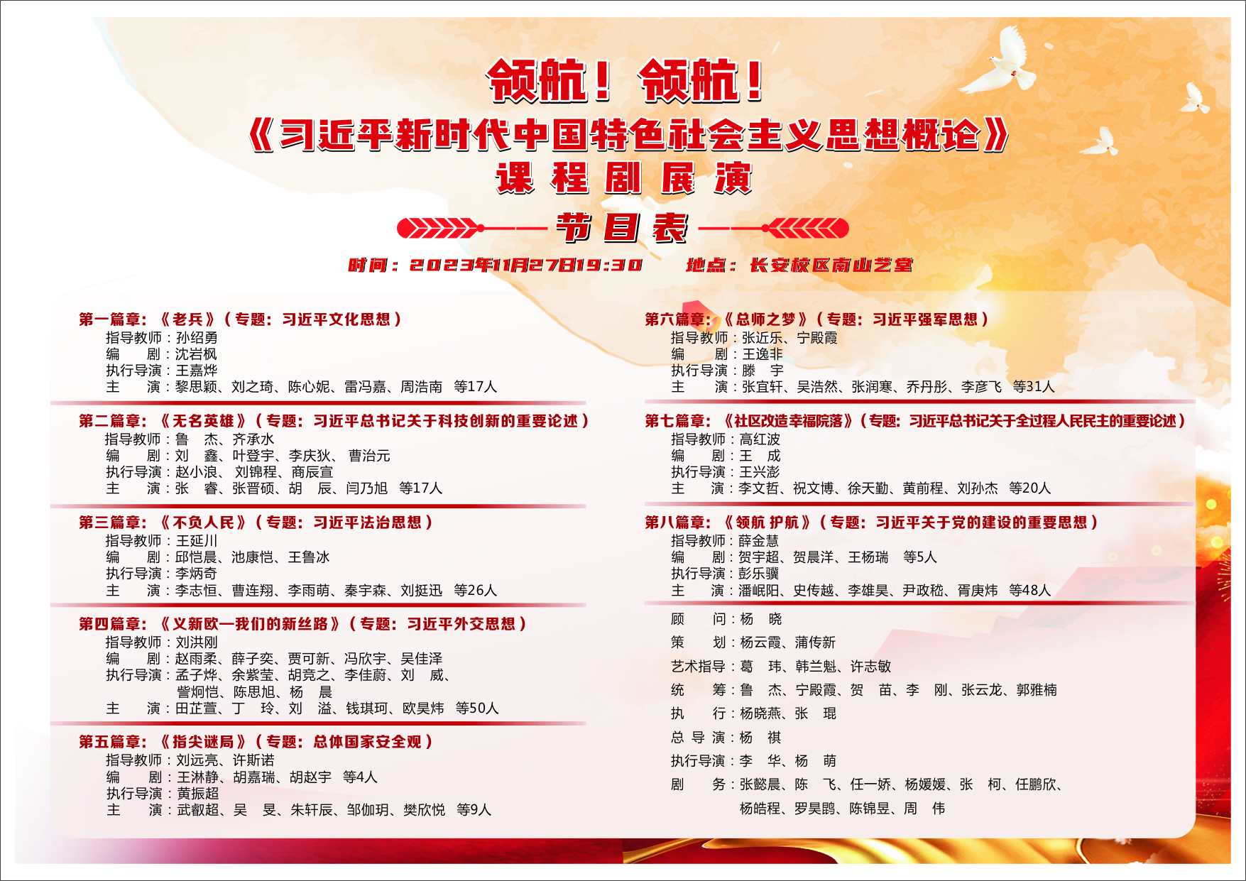 11月27日晚,第二届“领航!领航!《习近平新时代中国特色社会主义思想概论》”(以下简称《概论》课程剧)展演在长安校区南山艺堂举行。本届展演由beat365党委宣传部、党委学生工作部、教务处、教育基金会、马克思主义学院主办,校工会、离退休党委、艺术教育中心协办。