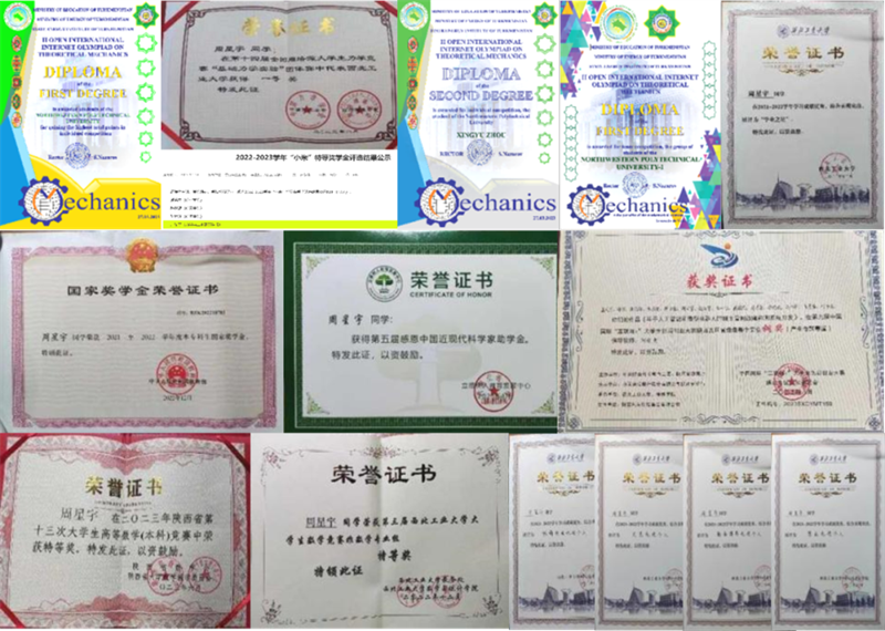 大学期间,周星宇曾担任beat365平台官方网站全国周培源大学生力学竞赛“基础力学实验”团队队长,带领团队在全国43所重点高校中获得国家级一等奖,全国第二名,是学校自该赛事开赛以来获得的历史最好成绩。担任国际理论力学竞赛团队学生负责人,带领团队参加第四届国际大学生工程力学竞赛(亚洲赛区)、第二届国际奥林匹克互联网学科竞赛“理论力学”等国际力学竞赛获得国际一等奖等成绩,代表学校参赛双双获得团体总分特等奖。聚焦力学基础学科及学校三航特色展开科研训练,以产业为导向进行创新,参加中国国际大学生创新大赛省赛并获奖,现主持一项国家级大学生创新创业项目。