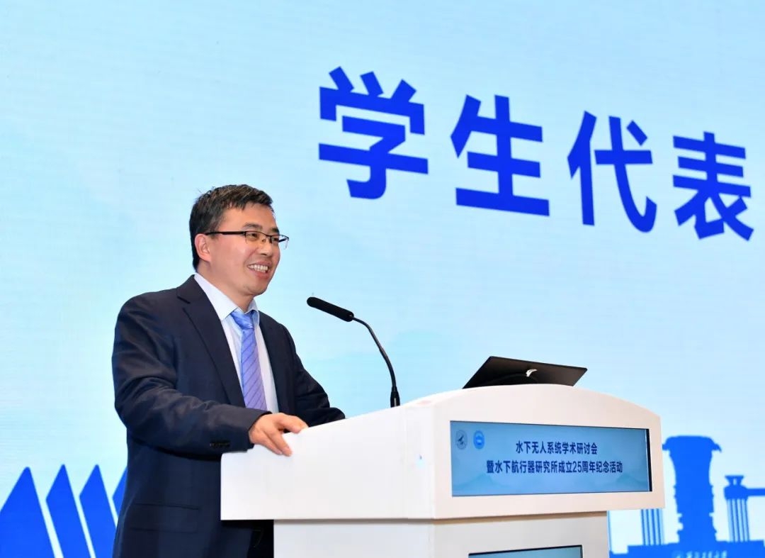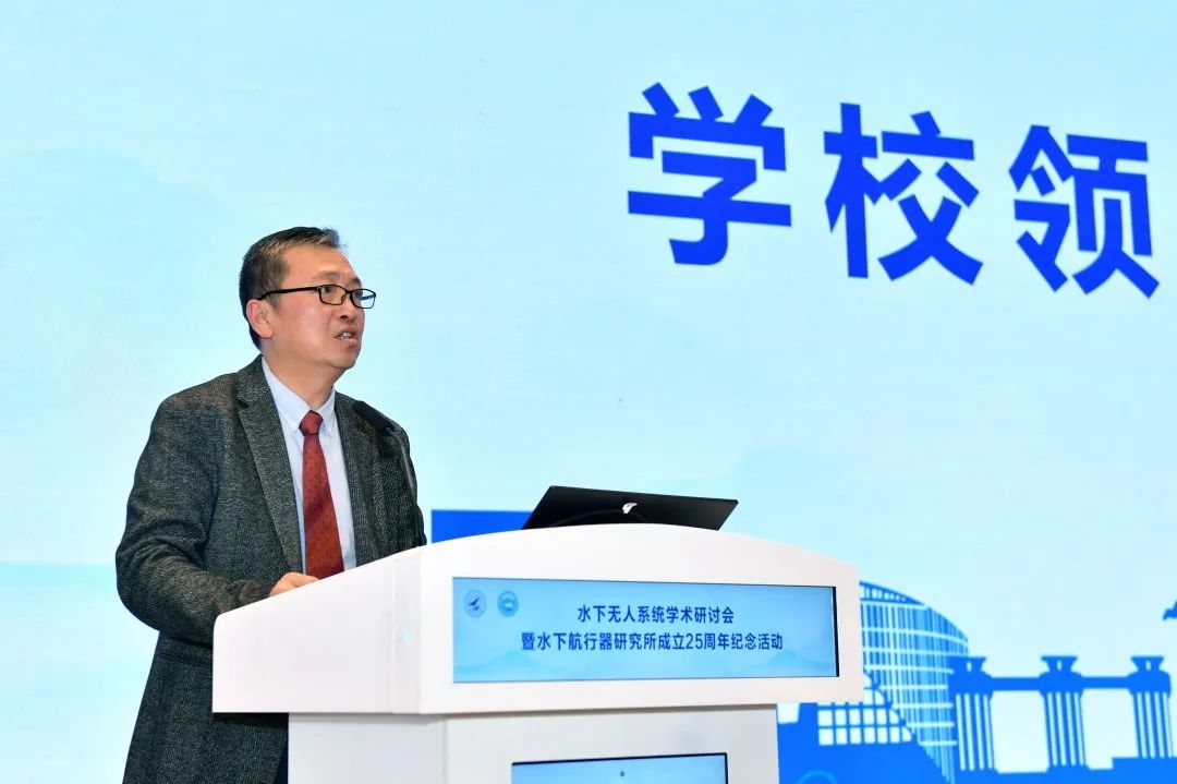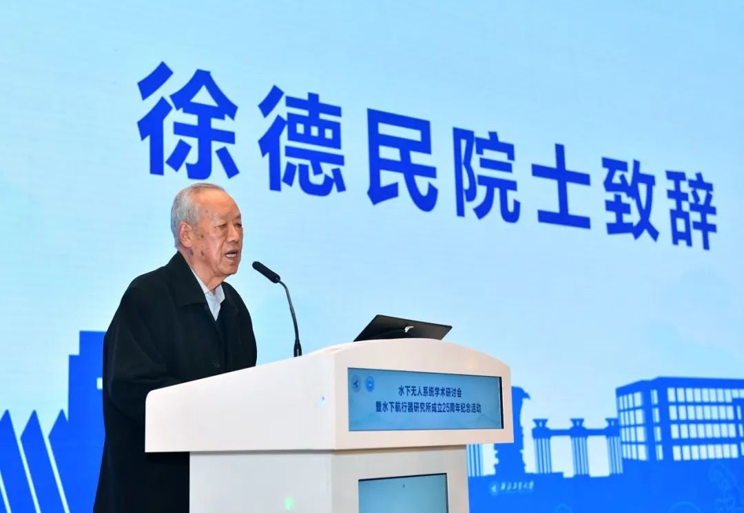 随后,研究所创始人徐德民院士上台致辞。他说,团队的发展壮大离不开学校的指导支持以及750试验场、昆船公司等兄弟单位的大力帮助。正是多方力量集结,精益求精,才能超指标完成任务,为国家海洋事业添砖加瓦。徐院士对研究所未来发展提出要求:“伟大新时代,奋进新征程,我们要坚持面向国家重大战略需求,面向国际科技前沿,发扬为国奉献的爱国精神;坚持自立自强,敢为人先,发扬自主创新精神;坚持勇挑重担,攻坚克难,发扬拼搏奋斗精神;坚持精诚团结,群策群力,发扬大力协同的团队精神。为实现中华民族伟大复兴,团队要再立新功、多做贡献!”