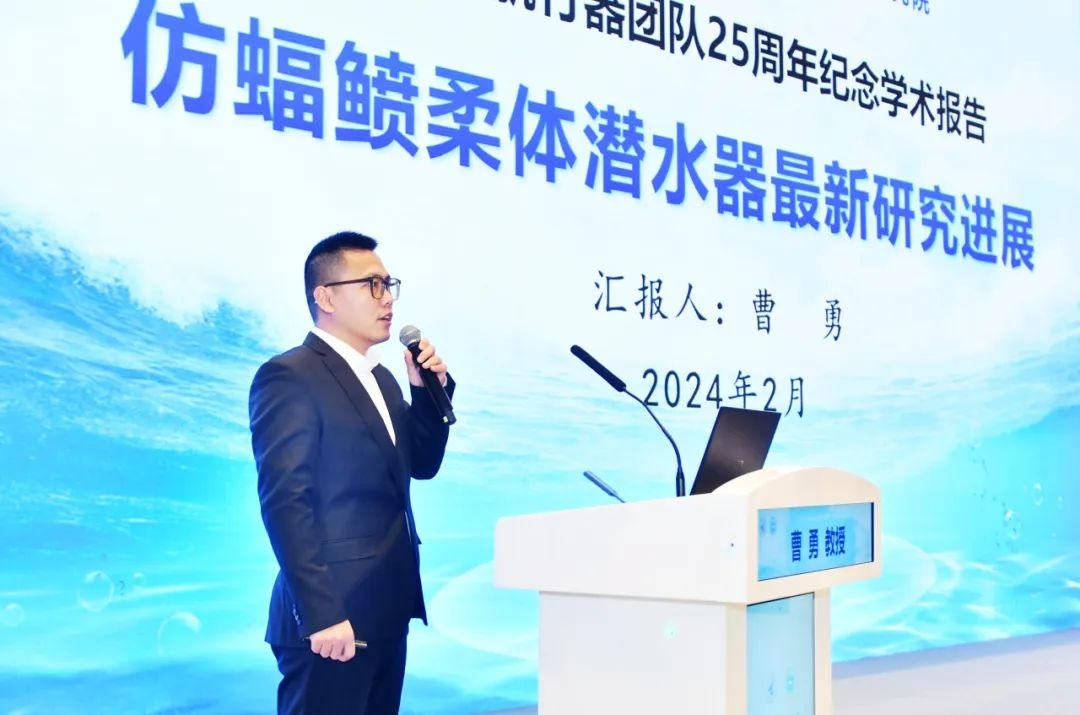 beat365平台官方网站水下航行器团队曹勇教授作“仿蝠鲼柔体潜水器最新研究进展”报告。为实施海洋生态保护、海洋安全保障等国家重大战略,亟需发展具备广域长时监测、复杂地形原位观测、生物同游抵近侦察等综合能力强的仿生潜水器。西工大创新提出滑扑一体仿蝠鲼柔体潜水器概念,突破“流固耦合仿真、滑扑一体推进、滑扑多模态仿生控制、太阳能俘能-柔性锂电储能”等关键技术,研制出10kg~720kg系列化仿蝠鲼柔体潜水器,实现长续航、高机动、高隐蔽、高生物亲和综合能力,完成全球首次应用级仿生潜水器千米级滑扑多模态海洋科考作业,并开展珊瑚礁科考、水文采集、地形扫描等典型应用,实现我国仿生水下装备走向实用化的重大突破。