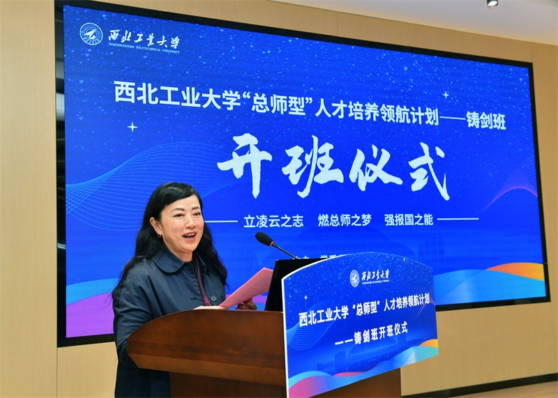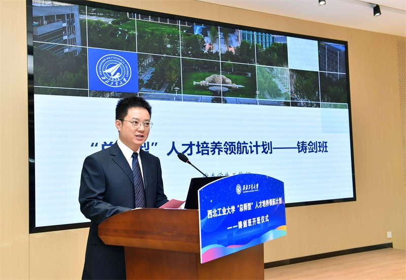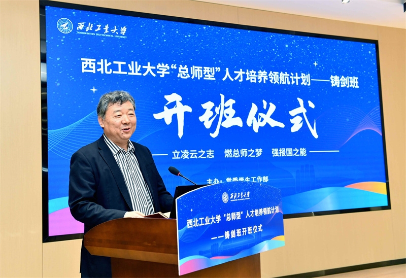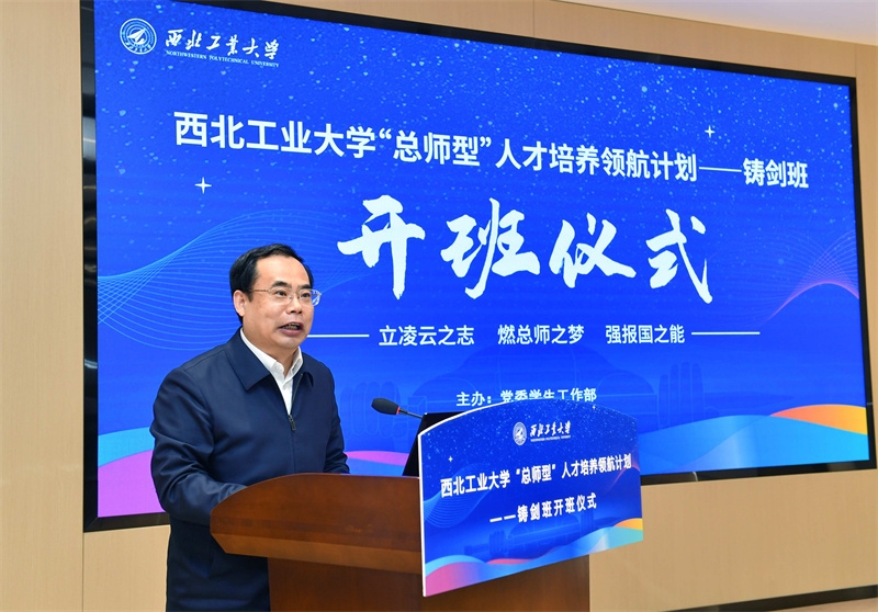 石鹏飞代表班级导师讲话。他对学弟学妹们进入铸剑班表示祝贺,也为自己能回到母校、为学校顶尖人才培养提供支撑感到由衷高兴。他指出,铸剑班的设立是落实习近平总书记人才强国战略、为国家培养卓越工程师的一个重要举措,具有很高的站位,突出了西工大的办学特色,希望学员们能够树立国际化视野、志存高远,以国家的需求为工作的导向和目标,脚踏实地,从基础学起,从基础实验做起,努力成长为“总师型”人才。