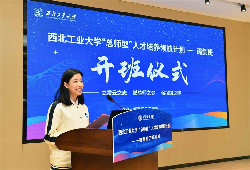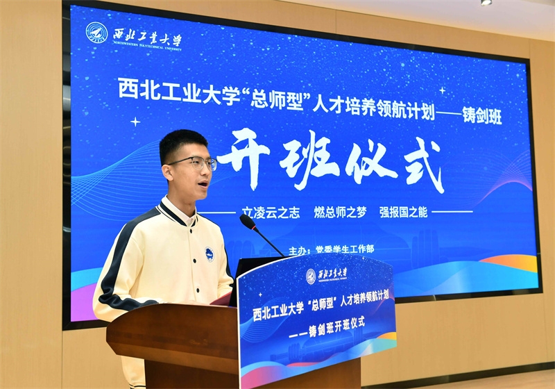 航空学院2023级本科生郭一麟代表全体学员发言,他首先对学校科学谋划、整合资源搭建铸剑班如此优质的平台表达了诚挚的感谢,回顾了充满挑战的领导力训练营选拔环节。他表示成为“铸剑班”的一员,不仅是一份荣誉、一份期待,更是一场考验,一场星光加身的蜕变。他代表全体学员郑重承诺,在未来一年的铸剑班培养中,必将全身心投入到专设核心课程、多元实践平台和精品实践项目中,铸魂、强知、赋能,向着成为德才兼备、全面发展的“总师型”人才的目标全力迈进。