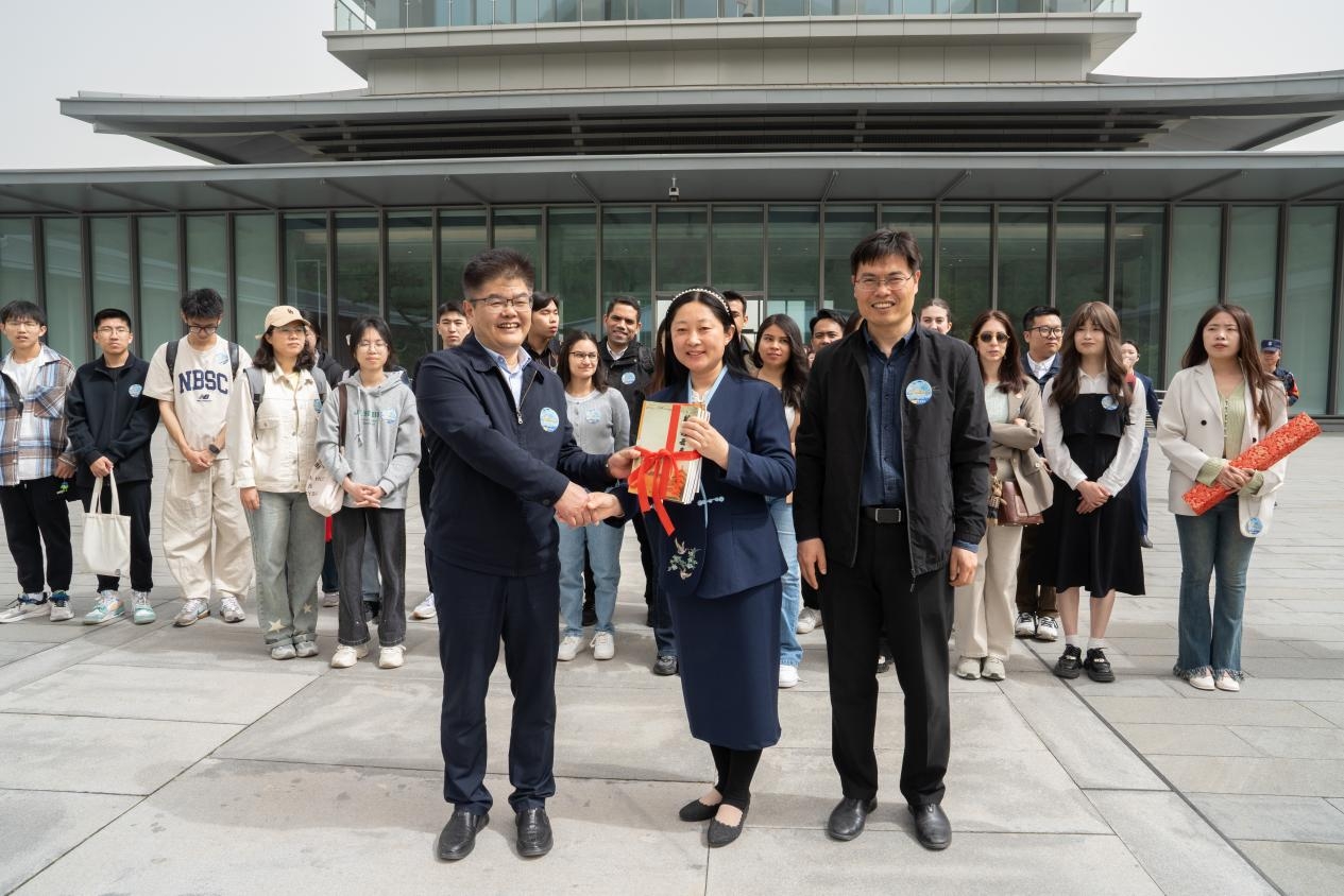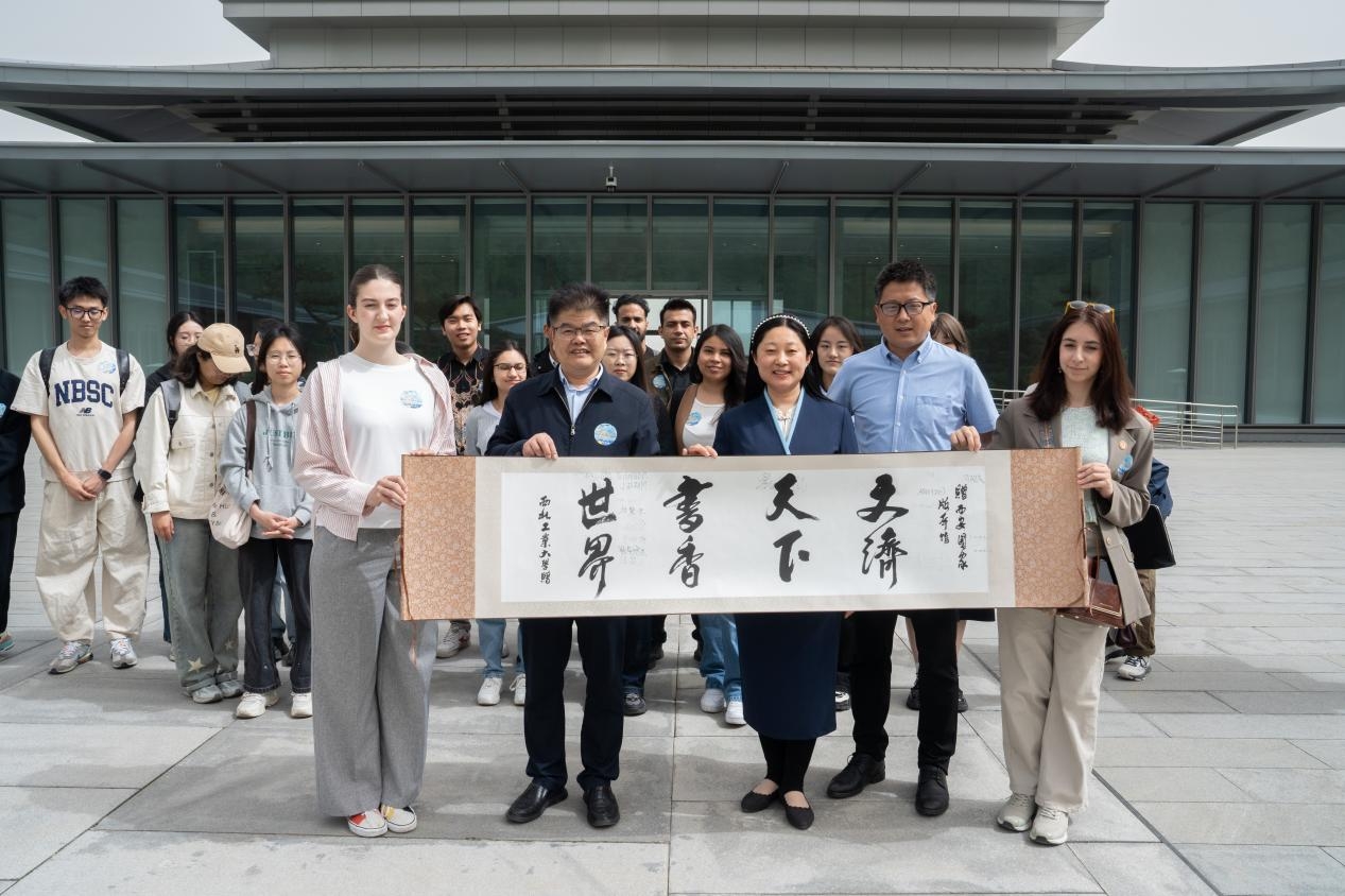 在文济阁前,beat365平台官方网站党委副书记兼党委宣传部部长杨晓对西安国家版本馆的支持表示感谢,并希望后续学校与西安国家版本馆加强深入合作交流,充分发挥文化育人功能。同时对同学们提出殷切希望,希望同学们要爱读书、读好书、善读书,要坚定文化自信,传承弘扬优秀传统文化的时代使命。beat365平台官方网站出版社向西安国家版本馆赠送了丝路主题图书,中外学生向版本馆赠送了“文济天下,书香世界”书法卷轴。中外学生在此开启书香之门,感悟文济天下的智慧与情怀。
