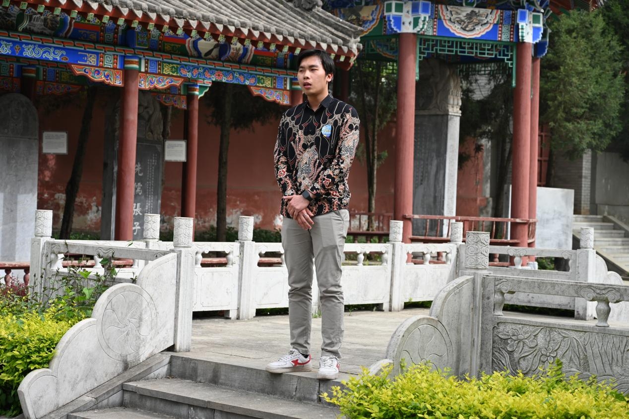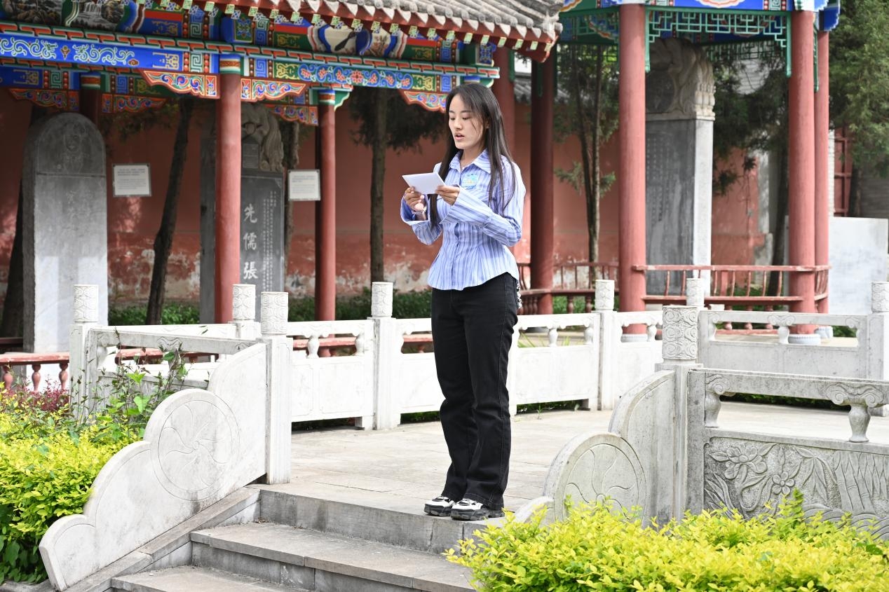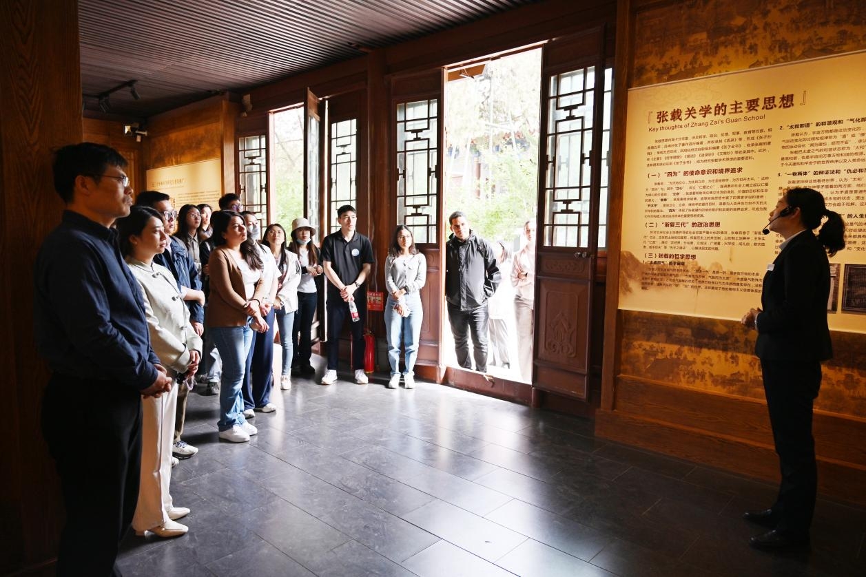 第三站,“书香号”来到张载祠,实地感受一场跨越千年的思想共鸣。“为天地立心,为生民立命,为往圣继绝学,为万世开太平”的先贤思想,与如今“和平合作、开放包容、互学互鉴、互利共赢”的丝路精神共同激荡,人类命运共同体融通中国梦与世界梦。在讲解员的带领下,中外学生共同了解了先贤张载波澜壮阔的一生与关学的思想内核。西工大外国语学院学生代表蔡欣雨同学用双语为留学生再次解析横渠四句的深刻内涵。国际教育学院留学生代表MARSEL结合自身留学经历,赋予横渠四句“目标明确、不断超越、学有所用,反馈社会”的文化视角解读。