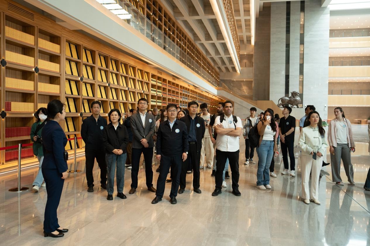 首站,师生们来到西安国家版本馆,即被眼前高台筑阁、中轴对称、大气恢弘的汉唐风格建筑群深深震撼,感受山霭苍苍、书海泛舟的深远意境。在这座新时代的国家文化殿堂,师生一行参观了西安版本馆结合陕西文化特色精心设置的两个展览:《赓续文脉 踔厉前行——中华文化经典版本展(西部篇)》和《褚墨遗珍 万里同风——丝绸之路版本展》,多样的展品彰显了深厚的历史文化底蕴和丝绸文化的独特魅力。