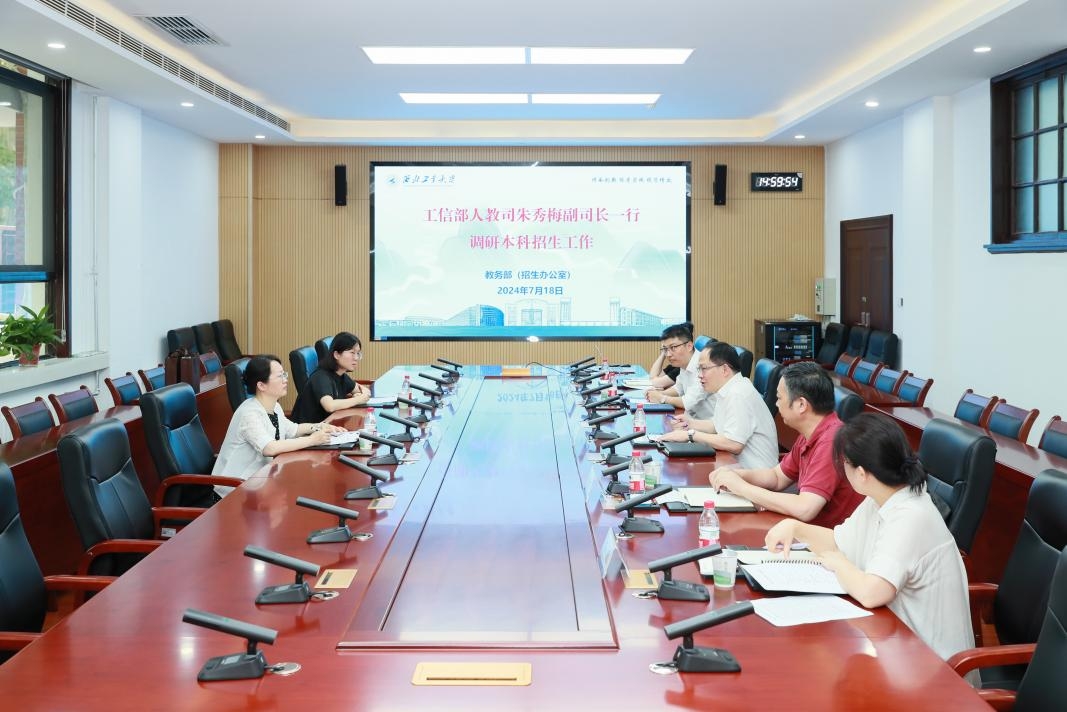 7月18日下午,工业和信息化部人事教育司副司长朱秀梅一行到beat365调研本科招生工作。副校长杨益新、教务部部长王海鹏、招生办公室主任兼教务部副部长王克勤、纪检监察机构第二纪检监察室主任王莹、招生办公室副主任马婷婷参加调研。