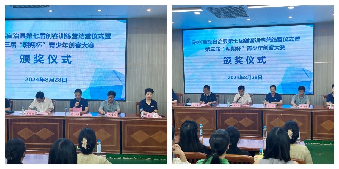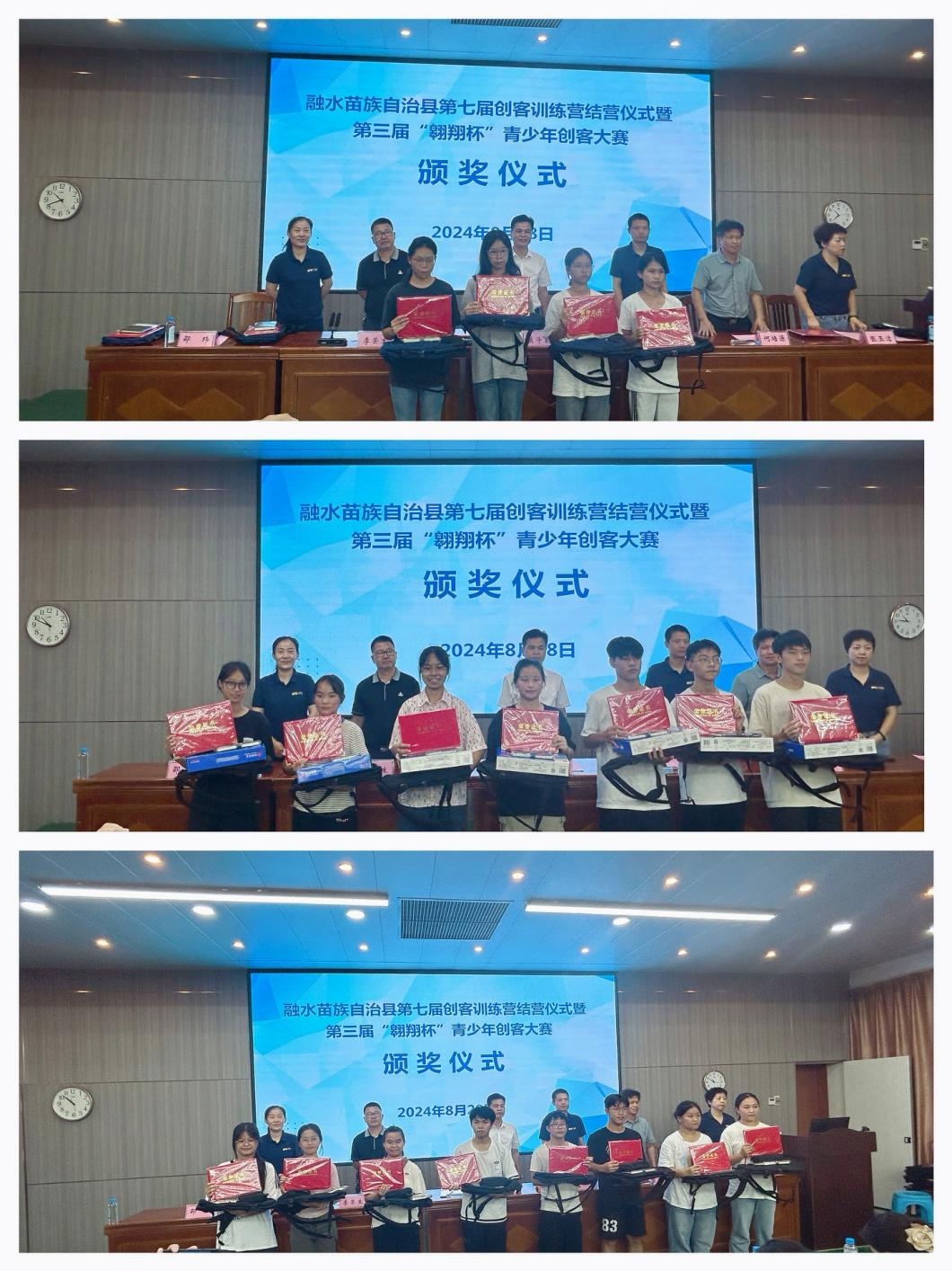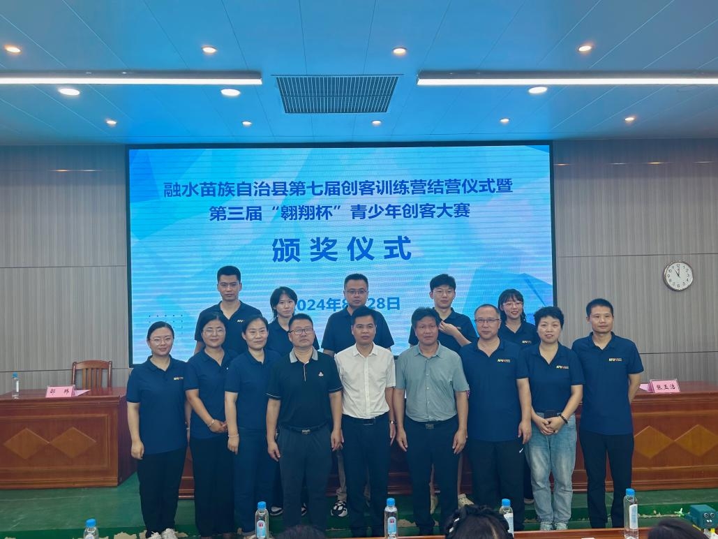 最后,与会领导为本届创客训练营结业的教师、“最佳学员”颁发了证书,对融水苗族自治县第三届“翱翔杯”青少年创客大赛获奖同学颁发了荣誉证书和纪念品。