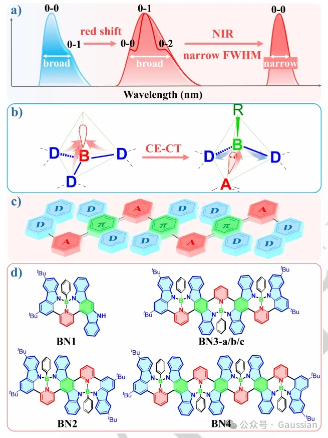 图1. 窄近红外发射硼桥π共轭体系的合理设计。a) 色移与窄发射的平衡。b) 三配位硼的电子接受性质及四配位硼的配位增强电荷转移示意图。c) D-π-A的交替排列。d) 硼桥接的D-π-A共轭框架的螺旋扭交联分子结构。
