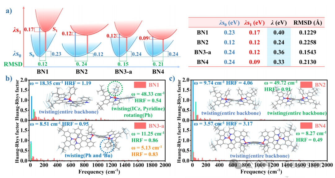 图5. a) 计算BN1-BN4的重组能(λ = λS1 + λS0)、均方根位移(RMSD)及对应势能面。b) 奇数硼分子(BN1和BN3-a)从S1到S0的Huang-Rays因子。c) 偶数硼分子(BN2和BN4)从S1到S0的Huang-Rays因子。插图:对Huang-Rhys因子贡献较大的振动模式。