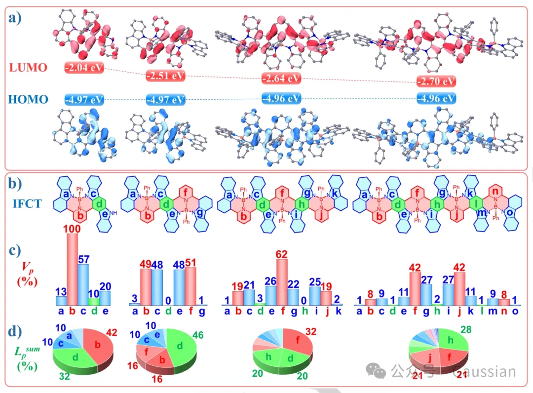 图4. a) DFT计算得到的BN1到BN4的前沿分子轨道与能级。b) BN1-BN4的片段分配及相应的标签。蓝色块表示供体片段,绿色块表示π片段,红色块表示受体片段。c) 柱状图,显示每个片段的净电荷变化百分比(Vp)。蓝色数字表示净电荷减少的供体片段和π片段,红色数字表示净电荷增加的受体片段。为清楚起见,用绝对值表示Vp。d) 饼图显示了代表局部激发程度(LE)的局部激发百分比(Lpsum)。