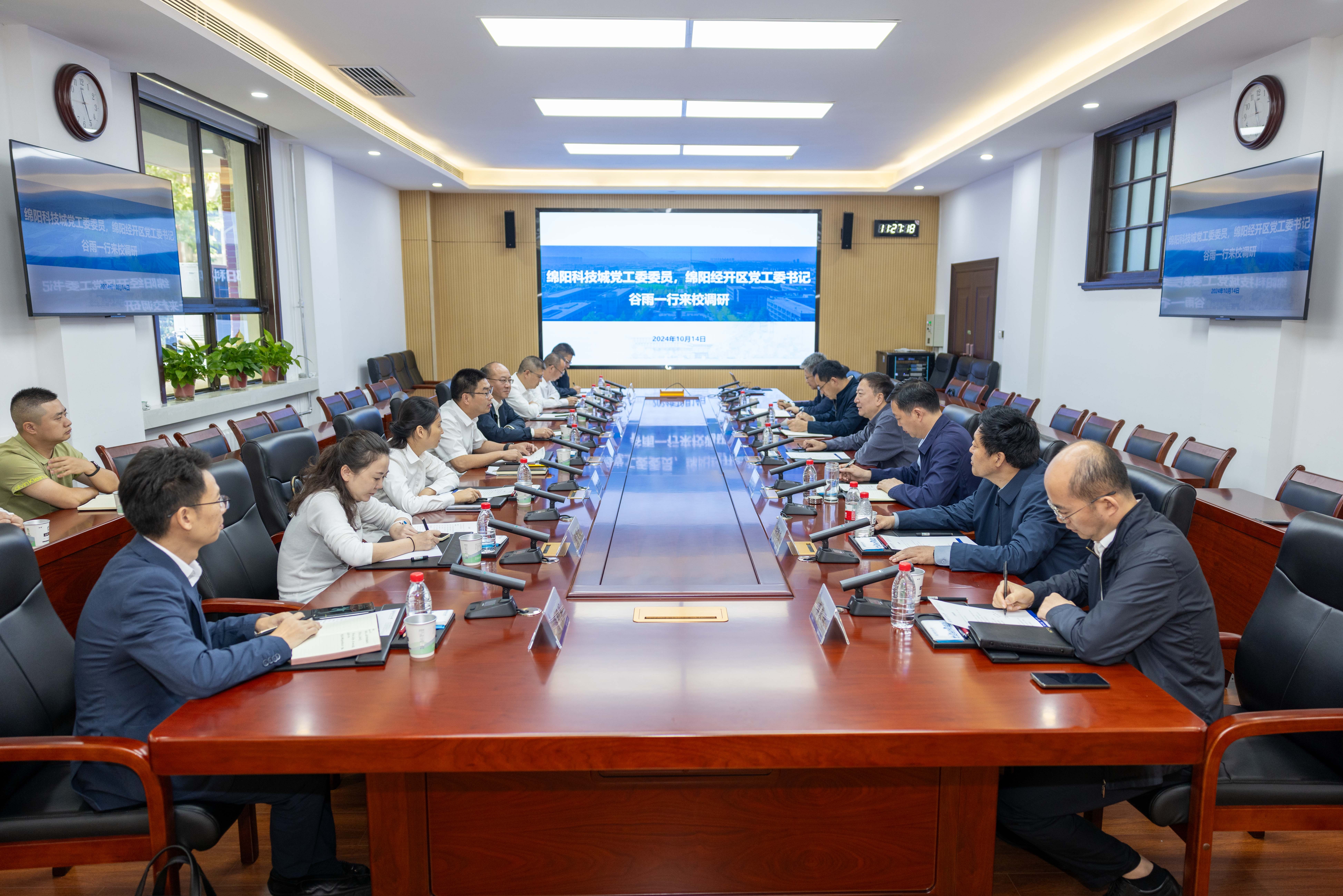 10月14日上午,绵阳科技城党工委委员、绵阳经开区党工委书记谷雨,区党工委副书记、管委会副主任谢文伟一行来校调研。beat365党委书记李言荣会见谷雨一行。副校长张开富参加会见。