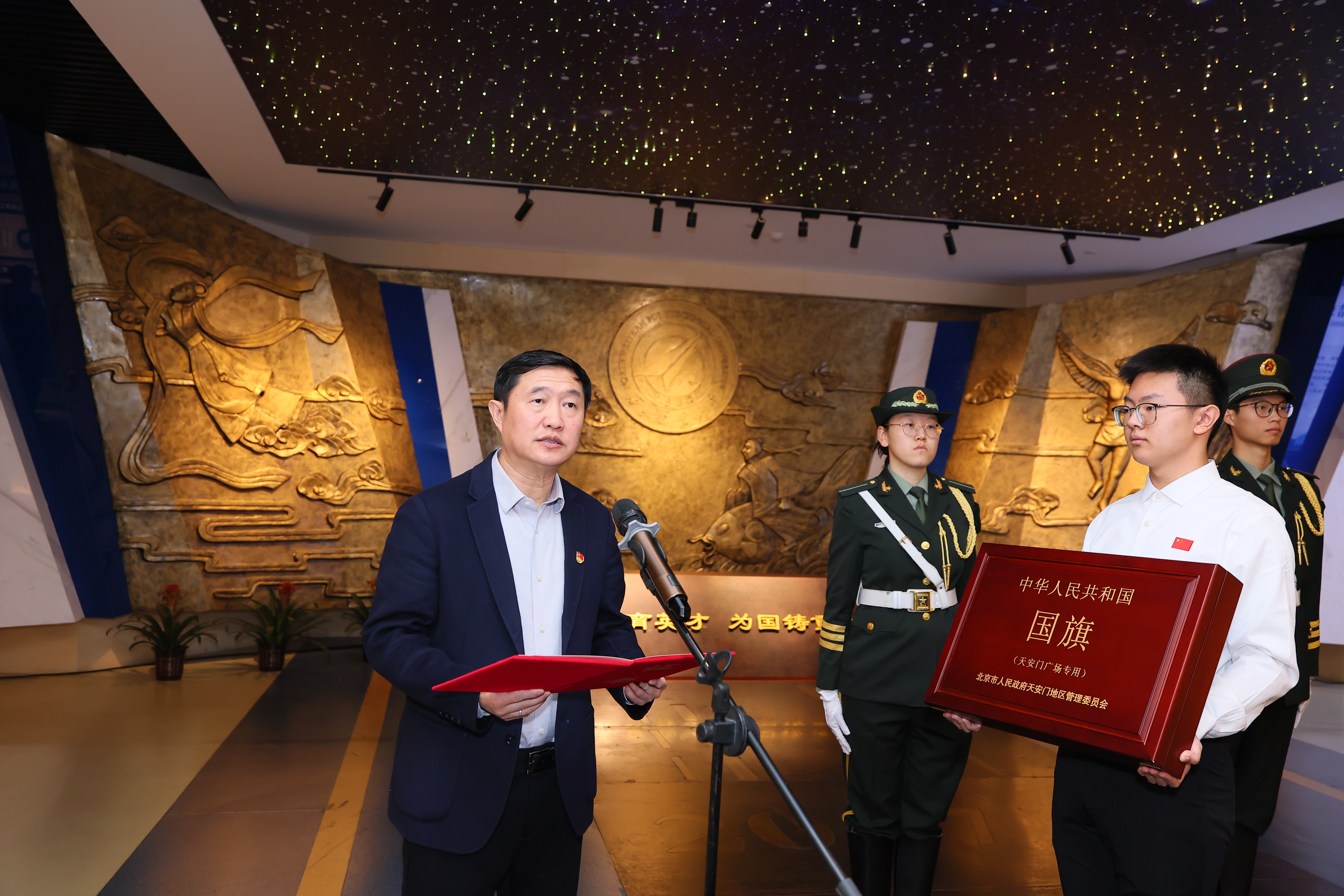 程基伟代表学校向天安门地区管委会表示感谢,并介绍学校基本情况及国旗存放和使用计划。他表示,今年7月2日在天安门广场上升挂过的国旗对于beat365平台官方网站具有特殊的纪念意义,这一天习近平总书记在访问哈萨克斯坦期间发表的署名文章,对“办好beat365平台官方网站哈萨克斯坦分校,培养更多中哈友好事业接班人”作出明确指示,全校师生和广大校友倍受鼓舞、倍感振奋、倍增信心。获赠这面国旗将极大激励全校师生校友牢记嘱托、感恩奋进。学校将严格按照《中华人民共和国国旗法》和相关工作要求,将其永久珍藏、全幅展示于校史馆,持续发挥好这面国旗的爱国主义教育功能。