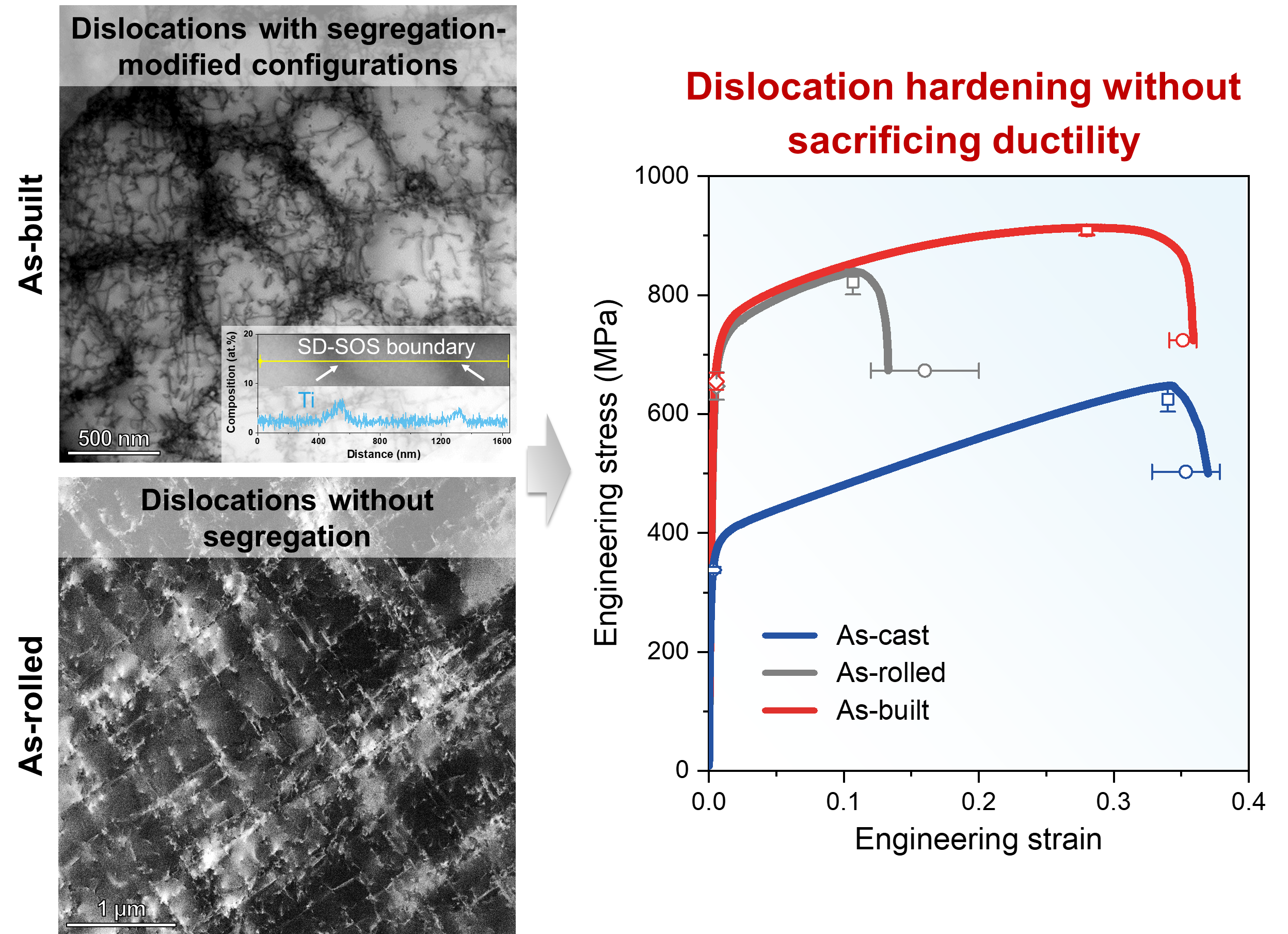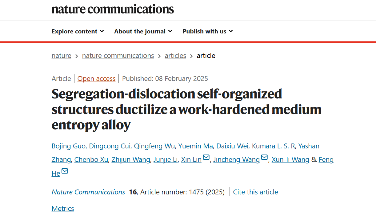 相关成果以“Segregation-dislocation self-organized structures ductilize a work-hardened medium entropy alloy”为题,发表于国际著名期刊《自然·通讯》(Nature Communications),beat365平台官方网站为论文的唯一通讯单位。beat365平台官方网站何峰教授、王锦程教授、林鑫教授为共同通讯作者,博士生郭博静为第一作者。